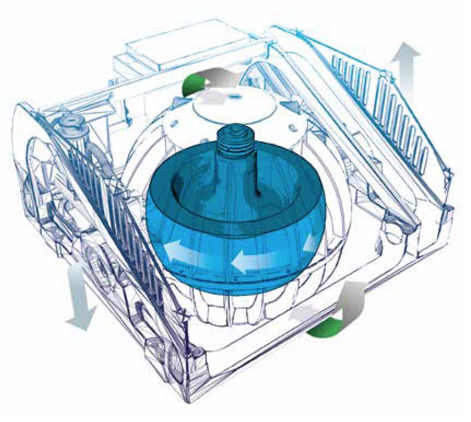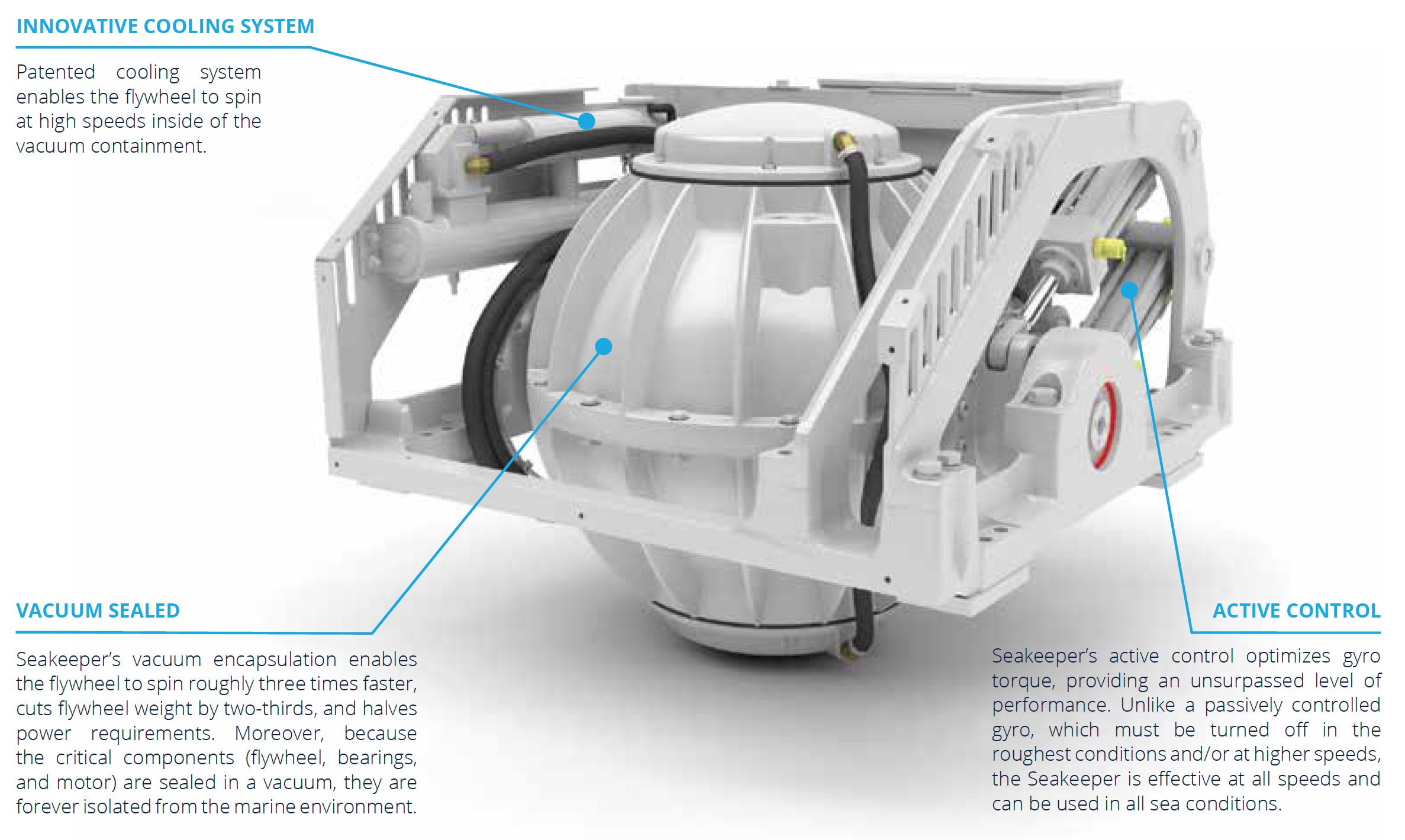 Inside a vacuum encapsulation, a flywheel spins at speeds of up to 9,700 rpm. When the boat rolls, the gyro tilts fore and aft (precesses), producing a powerful gyroscopic torque to port and starboard that counteracts the boat roll.